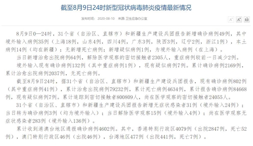 | 國家衛(wèi)健委:8月9日新增確診病例49例 其中本土病例14例均在新疆 |
