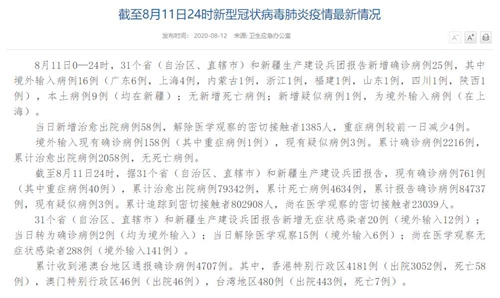 情況顯示,截至8月11日24時(shí),據(jù)31個(gè)?。ㄗ灾螀^(qū)、直轄市)和新疆生產(chǎn)建設(shè)兵團(tuán)報(bào)告,現(xiàn)有確診病例761例(其中重癥病例40例),累計(jì)治愈出院病例79342例,累計(jì)死亡病例4634例,累計(jì)報(bào)告確診病例84737例,現(xiàn)有疑似病例3例。累計(jì)追蹤到密切接觸者802908人,尚在醫(yī)學(xué)觀察的密切接觸者23039人。