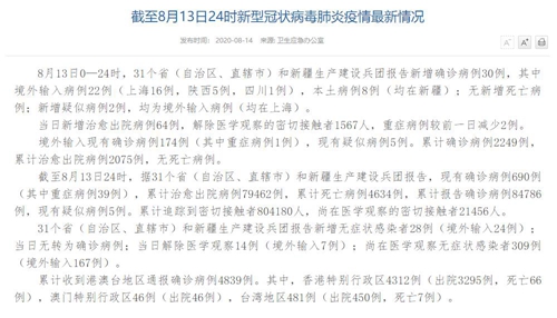 人民網北京8月14日電(董童)國家衛(wèi)生健康委于今日在官網發(fā)布的《截至8月13日24時新型冠狀病毒肺炎疫情最新情況》(以下簡稱“情況”)提出,8月13日0—24時,31個?。ㄗ灾螀^(qū)、直轄市)和新疆生產建設兵團報告新增確診病例30例,其中境外輸入病例22例(上海16例,陜西5例,四川1例),本土病例8例(均在新疆);無新增死亡病例;新增疑似病例2例,均為境外輸入病例(均在上海)。當日新增治愈出院病例64例,解除醫(yī)學觀察的密切接觸者1567人,重癥病例較前一日減少2例。
