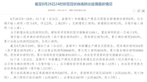 人民網(wǎng)北京8月27日電(董童)國家衛(wèi)生健康委于今日在官網(wǎng)發(fā)布的《截至8月26日24時(shí)新型冠狀病毒肺炎疫情最新情況》(以下簡(jiǎn)稱“情況”)提出,8月26日0—24時(shí),31個(gè)?。ㄗ灾螀^(qū)、直轄市)和新疆生產(chǎn)建設(shè)兵團(tuán)報(bào)告新增確診病例8例,均為境外輸入病例(四川4例,河北2例,上海2例);無新增死亡病例;新增疑似病例1例,為境外輸入病例(在上海)。當(dāng)日新增治愈出院病例31例,解除醫(yī)學(xué)觀察的密切接觸者1189人,重癥病例較前一日減少3例。