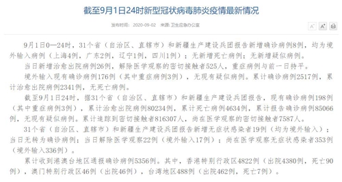 截至9月1日24時,據(jù)31個省(自治區(qū)、直轄市)和新疆生產(chǎn)建設(shè)兵團(tuán)報告,現(xiàn)有確診病例198例(其中重癥病例3例),累計治愈出院病例80234例,累計死亡病例4634例,累計報告確診病例85066例,無現(xiàn)有疑似病例。累計追蹤到密切接觸者816307人,尚在醫(yī)學(xué)觀察的密切接觸者7587人。