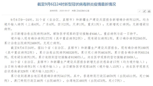 人民網(wǎng)北京9月7日電(董童)國(guó)家衛(wèi)生健康委于今日在官網(wǎng)發(fā)布的《截至9月6日24時(shí)新型冠狀病毒肺炎疫情最新情況》(以下簡(jiǎn)稱“情況”)提出,9月6日0—24時(shí),31個(gè)省(自治區(qū)、直轄市)和新疆生產(chǎn)建設(shè)兵團(tuán)報(bào)告新增確診病例12例,均為境外輸入病例(上海4例,廣東4例,四川2例,天津1例,重慶1例);無(wú)新增死亡病例;無(wú)新增疑似病例。當(dāng)日新增治愈出院病例18例,解除醫(yī)學(xué)觀察的密切接觸者646人,重癥病例與前一日持平。