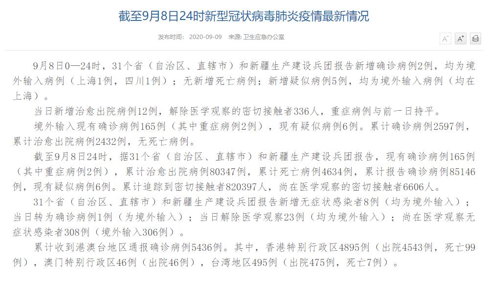 情況顯示,截至9月8日24時(shí),據(jù)31個(gè)?。ㄗ灾螀^(qū)、直轄市)和新疆生產(chǎn)建設(shè)兵團(tuán)報(bào)告,現(xiàn)有確診病例165例(其中重癥病例2例),累計(jì)治愈出院病例80347例,累計(jì)死亡病例4634例,累計(jì)報(bào)告確診病例85146例,現(xiàn)有疑似病例6例。累計(jì)追蹤到密切接觸者820397人,尚在醫(yī)學(xué)觀察的密切接觸者6606人。