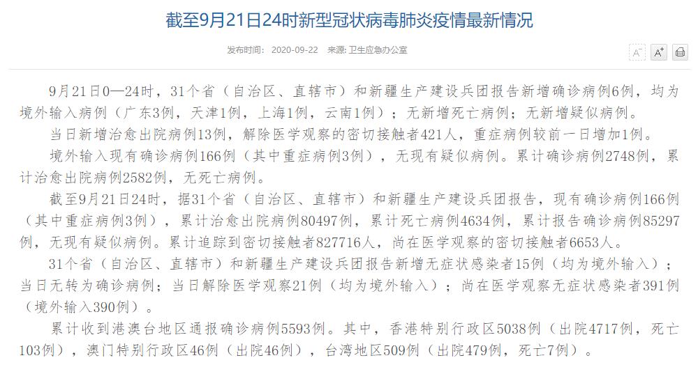 情況顯示,截至9月21日24時(shí),據(jù)31個(gè)?。ㄗ灾螀^(qū)、直轄市)和新疆生產(chǎn)建設(shè)兵團(tuán)報(bào)告,現(xiàn)有確診病例166例(其中重癥病例3例),累計(jì)治愈出院病例80497例,累計(jì)死亡病例4634例,累計(jì)報(bào)告確診病例85297例,無(wú)現(xiàn)有疑似病例。累計(jì)追蹤到密切接觸者827716人,尚在醫(yī)學(xué)觀察的密切接觸者6653人。