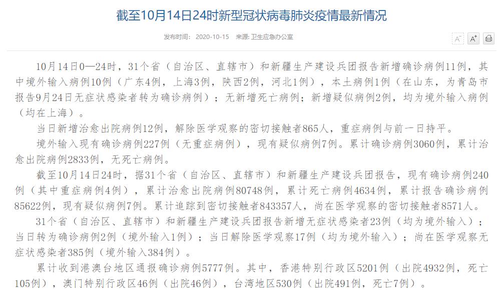 人民網(wǎng)北京10月15日電(董童)國家衛(wèi)生健康委于今日在官網(wǎng)發(fā)布的《截至10月14日24時(shí)新型冠狀病毒肺炎疫情最新情況》(以下簡稱“情況”)提出,10月14日0—24時(shí),31個(gè)?。ㄗ灾螀^(qū)、直轄市)和新疆生產(chǎn)建設(shè)兵團(tuán)報(bào)告新增確診病例11例,其中境外輸入病例10例(廣東4例,上海3例,陜西2例,河北1例),本土病例1例(在山東,為青島市報(bào)告9月24日無癥狀感染者轉(zhuǎn)為確診病例);無新增死亡病例;新增疑似病例2例,均為境外輸入病例(均在上海)。當(dāng)日新增治愈出院病例12例,解除醫(yī)學(xué)觀察的密切接觸者865人,重癥病例與前一日持平。