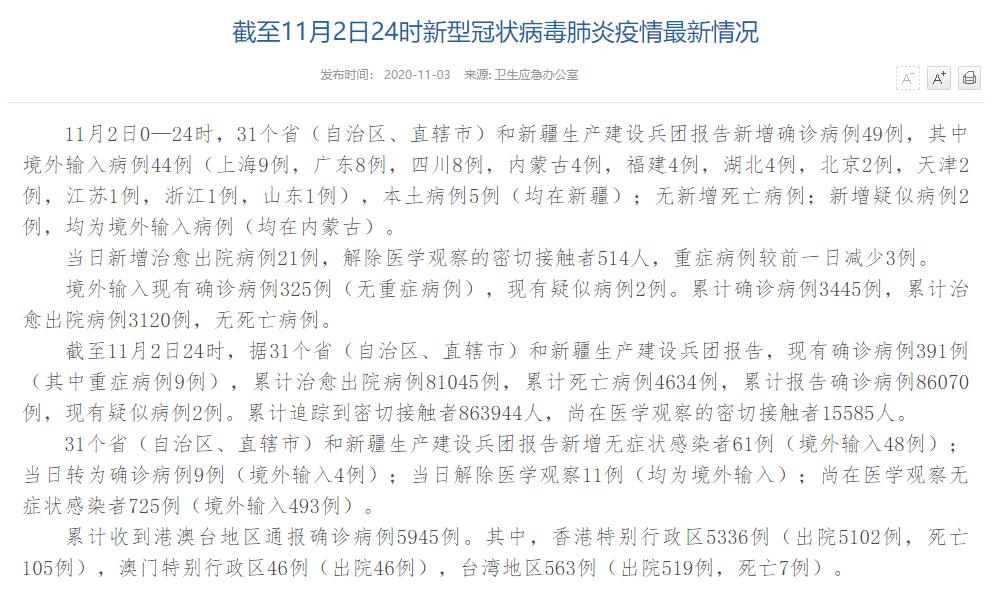 人民網(wǎng)北京11月3日電(董童)國(guó)家衛(wèi)生健康委于今日在官網(wǎng)發(fā)布的《截至11月2日24時(shí)新型冠狀病毒肺炎疫情最新情況》(以下簡(jiǎn)稱(chēng)“情況”)指出,11月2日0—24時(shí),31個(gè)?。ㄗ灾螀^(qū)、直轄市)和新疆生產(chǎn)建設(shè)兵團(tuán)報(bào)告新增確診病例49例,其中境外輸入病例44例(上海9例,廣東8例,四川8例,內(nèi)蒙古4例,福建4例,湖北4例,北京2例,天津2例,江蘇1例,浙江1例,山東1例),本土病例5例(均在新疆);無(wú)新增死亡病例;新增疑似病例2例,均為境外輸入病例(均在內(nèi)蒙古)。當(dāng)日新增治愈出院病例21例,解除醫(yī)學(xué)觀(guān)察的密切接觸者514人,重癥病例較前一日減少3例。