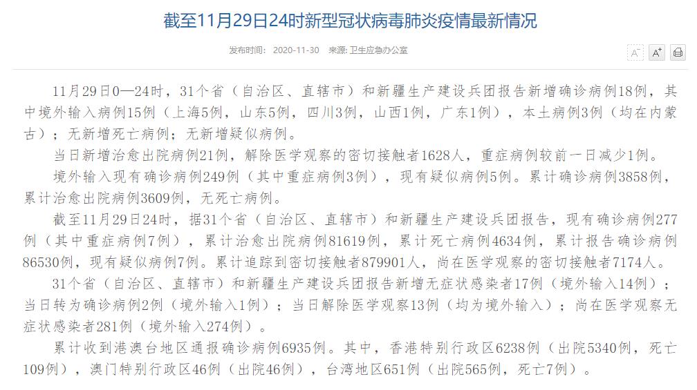 人民網(wǎng)北京11月30日電(董童)國家衛(wèi)生健康委于今日在官網(wǎng)發(fā)布的《截至11月29日24時新型冠狀病毒肺炎疫情最新情況》(以下簡稱“情況”)指出,11月29日0—24時,31個省(自治區(qū)、直轄市)和新疆生產(chǎn)建設(shè)兵團(tuán)報告新增確診病例18例,其中境外輸入病例15例(上海5例,山東5例,四川3例,山西1例,廣東1例),本土病例3例(均在內(nèi)蒙古);無新增死亡病例;無新增疑似病例。當(dāng)日新增治愈出院病例21例,解除醫(yī)學(xué)觀察的密切接觸者1628人,重癥病例較前一日減少1例。