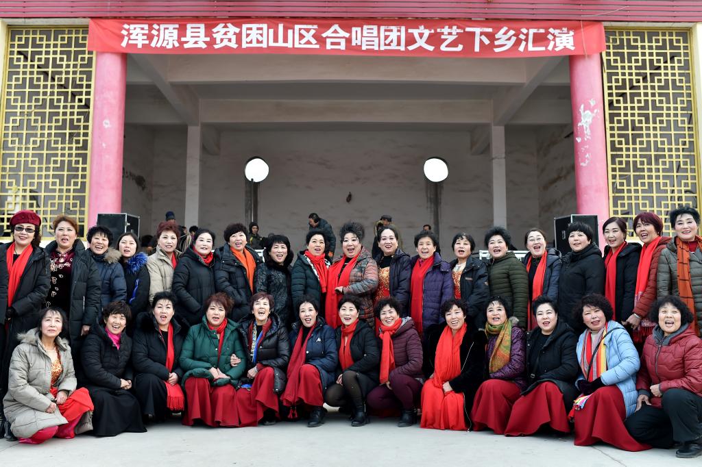 ↑1月3日,在山西省渾源縣荊莊村,渾源縣貧困山區(qū)合唱團(tuán)在表演歌舞《看山看水看中國》。