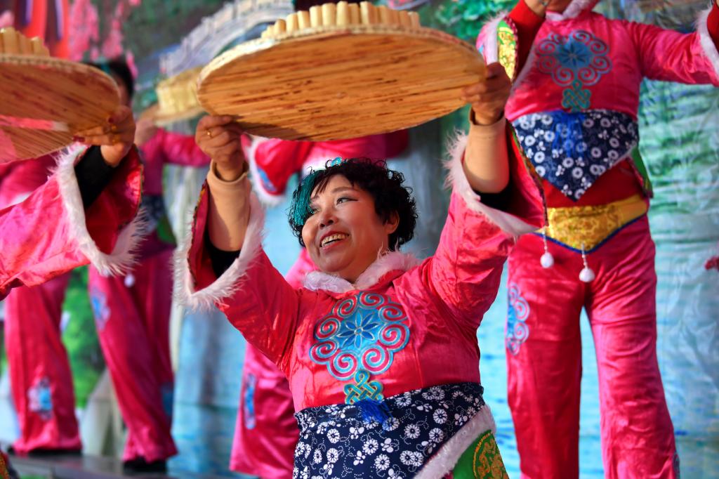 ↑1月3日,在山西省渾源縣荊莊村,渾源縣貧困山區(qū)合唱團(tuán)在表演舞蹈《大豐收》。