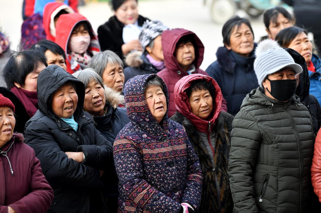 ↑1月3日,在山西省渾源縣荊莊村,村民們在欣賞渾源縣貧困山區(qū)合唱團(tuán)的演出。