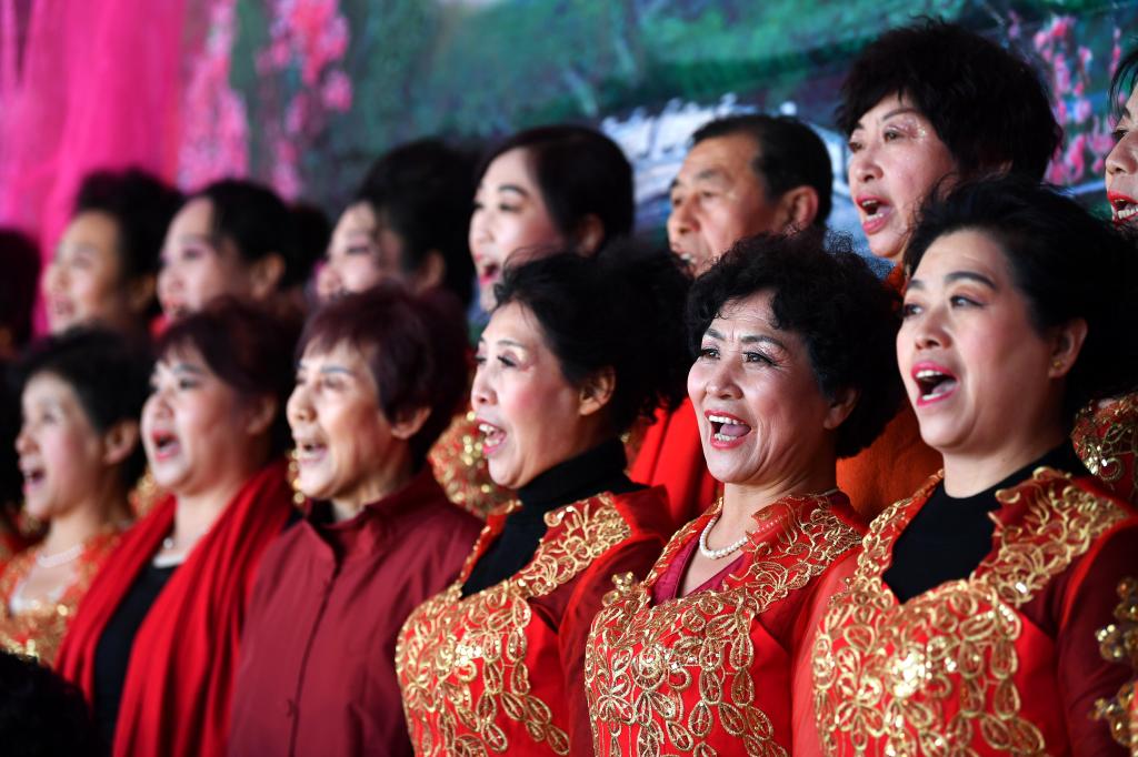 ↑1月3日,在山西省渾源縣荊莊村,渾源縣貧困山區(qū)合唱團(tuán)在表演合唱《紅梅贊》。