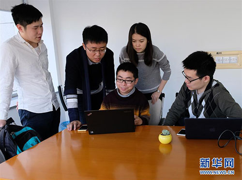矣曉沅(左三)與同學(xué)們在實驗室討論會上(資料照片)。 新華社發(fā)