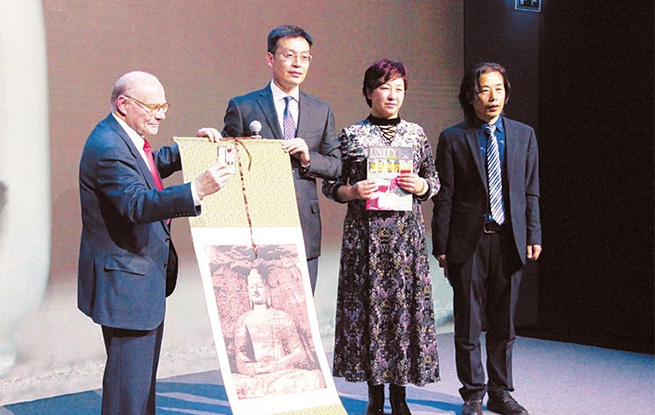 阿蘭·蓬皮杜先生接受大同市贈(zèng)送非物質(zhì)文化遺產(chǎn)作品。本報(bào)通訊員攝