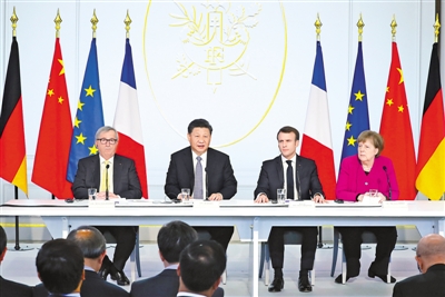 | 3月26日,國家主席習(xí)近平在巴黎同法國總統(tǒng)馬克龍一道出席中法全球治理論壇閉幕式。德國總理默克爾、歐盟委員會主席容克應(yīng)邀出席。 新華社記者 鞠 鵬攝 |