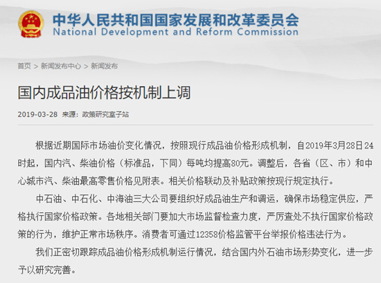 人民網(wǎng)北京3月28日電 (王紹紹) 國家發(fā)改委剛剛發(fā)布通知, 根據(jù)近期國際市場油價變化情況,按照現(xiàn)行成品油價格形成機制,自2019年3月28日24時起,國內(nèi)汽、柴油價格(標準品,下同)每噸均提高80元。調(diào)整后,各?。▍^(qū)、市)和中心城市汽、柴油最高零售價格見附表。相關價格聯(lián)動及補貼政策按現(xiàn)行規(guī)定執(zhí)行。