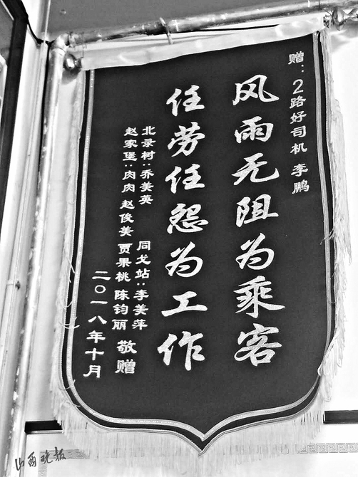 撿到東西歸還失主,失主送來表揚(yáng)信比較常見,山西晚報(bào)記者發(fā)現(xiàn)有一張比較例外。一位署名“2路乘客”的感謝信中這樣寫道:“2017年以前,可以說偶爾坐2路,因?yàn)榻?jīng)常會(huì)有等不上車的情況。但自從李鵬接上2路以后,基本上沒出現(xiàn)過等不上車的情況……作為長期乘坐公交的乘客真心非常感謝……”錦旗是7名乘客集體送的,“風(fēng)雨無阻為乘客,任勞任怨為工作”,14個(gè)字,表達(dá)的是乘客對李鵬的認(rèn)可。