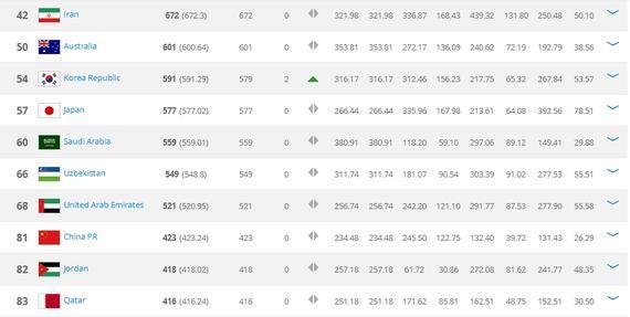 由于4月份沒有國家隊賽事,因此,大多數國家隊的積分都沒有上漲,亞洲前10位球隊的世界排名大多沒有變化,只有韓國隊小幅上升了兩個位次,從第56升至第54。而中國隊跟上一期排名完全一樣,依然排世界第81位,在亞洲依然排名第8。