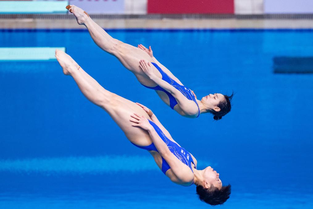 11月27日,廣東海印隊選手陳藝文(下)/湖北浩沙隊選手昌雅妮在女子雙人3米板決賽中奪冠。新華社發(fā)(杜子璇攝)
