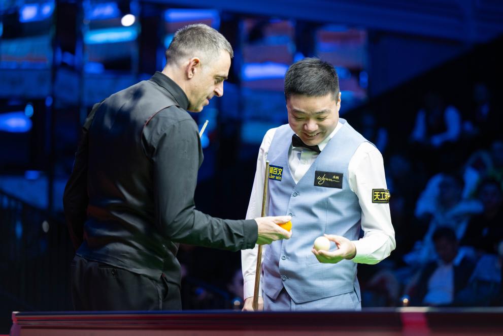 12月25日,奧沙利文(左)與丁俊暉在表演賽中。當(dāng)日,2023年澳門斯諾克大師邀請賽拉開帷幕。新華社記者 張金加 攝