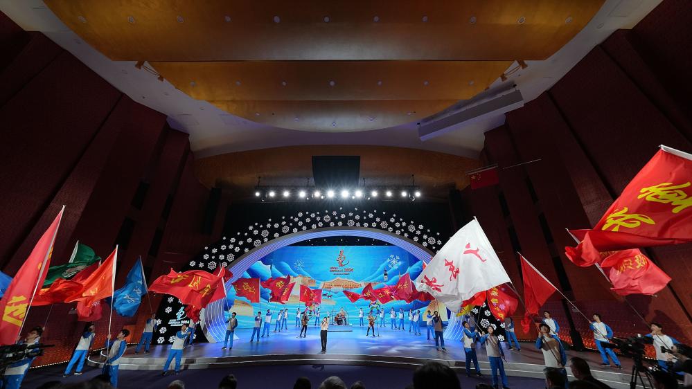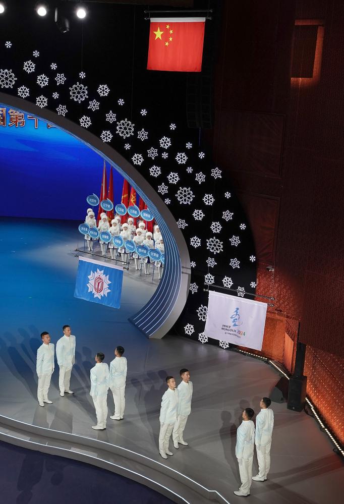這是2月27日拍攝的第十四屆全國冬季運動會閉幕式現(xiàn)場。新華社記者 李欣 攝 冰雪相約,同心筑夢。27日20時許,“十四冬”閉幕式在呼倫貝爾大劇院開始。在歡快熱烈的氣氛中,各參賽代表團旗幟入場。全體起立,奏唱中華人民共和國國歌。 第十四屆全國冬季運動會組委會副主任、國家體育總局副局長周進強宣讀關(guān)于授予中華人民共和國第十四屆冬季運動會參賽代表團體育道德風(fēng)尚獎和參賽紀(jì)念獎的決定。隨后,國家體育總局向“十四冬”承辦地內(nèi)蒙古自治區(qū)贈送紀(jì)念品。