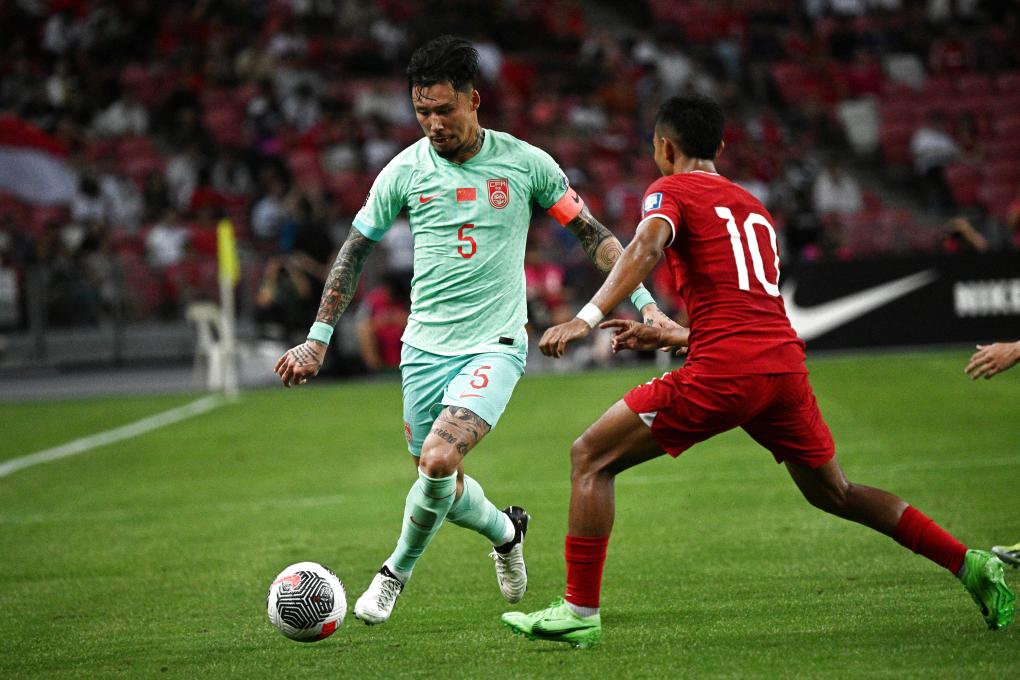 3月21日,中國隊球員張琳芃(左)在比賽中與新加坡隊球員拉姆利拼搶。新華社發(fā)(鄧智煒攝)