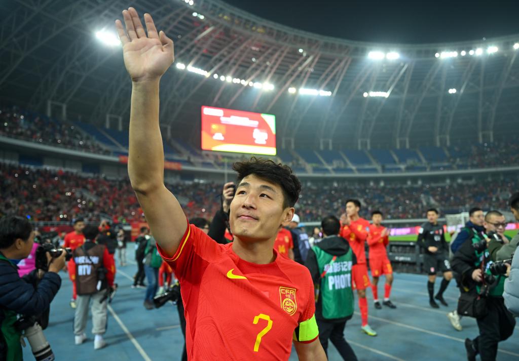 3月26日,武磊在2026年國際足聯(lián)世界杯亞洲區(qū)預(yù)選賽36強賽C組中國隊主場4:1戰(zhàn)勝新加坡隊的比賽后向觀眾致意。新華社記者 孫凡越 攝