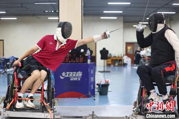即將出征巴黎殘奧會的擊劍運(yùn)動員仲賽春(左)與隊友胡道亮練習(xí)擊劍動作。中新網(wǎng)記者泱波 攝