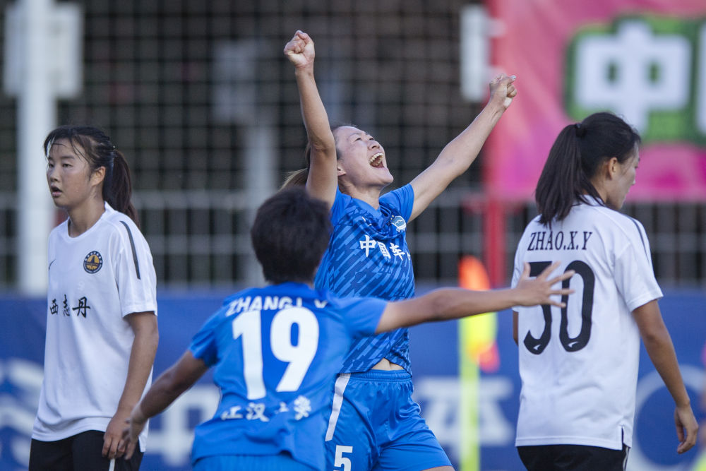 9月28日,武漢車谷江大隊球員吳海燕(右二)進球后慶祝。新華社記者 伍志尊 攝