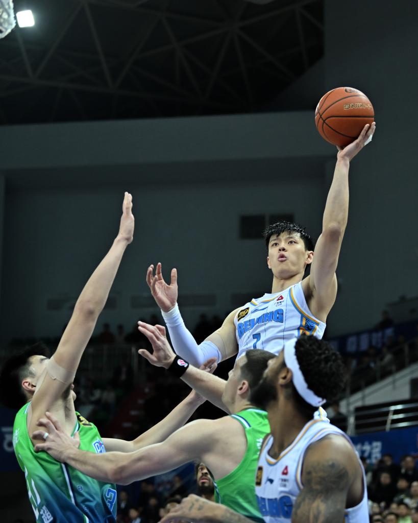 3月31日,北京隊(duì)球員曾凡博(上)在比賽中投籃。新華社記者 孫凡越 攝