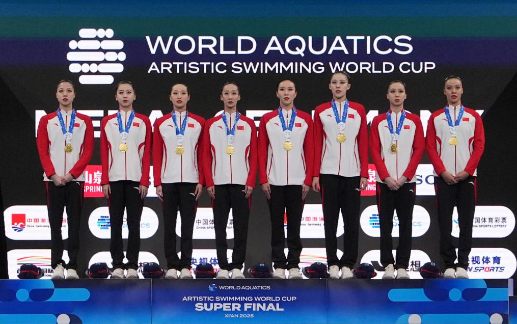 冠軍中國隊(duì)在集體技巧自選決賽頒獎(jiǎng)儀式上。15日,在2025年花樣游泳世界杯總決賽集體技巧自選決賽中,中國隊(duì)獲得冠軍。新華社記者 李一博 攝