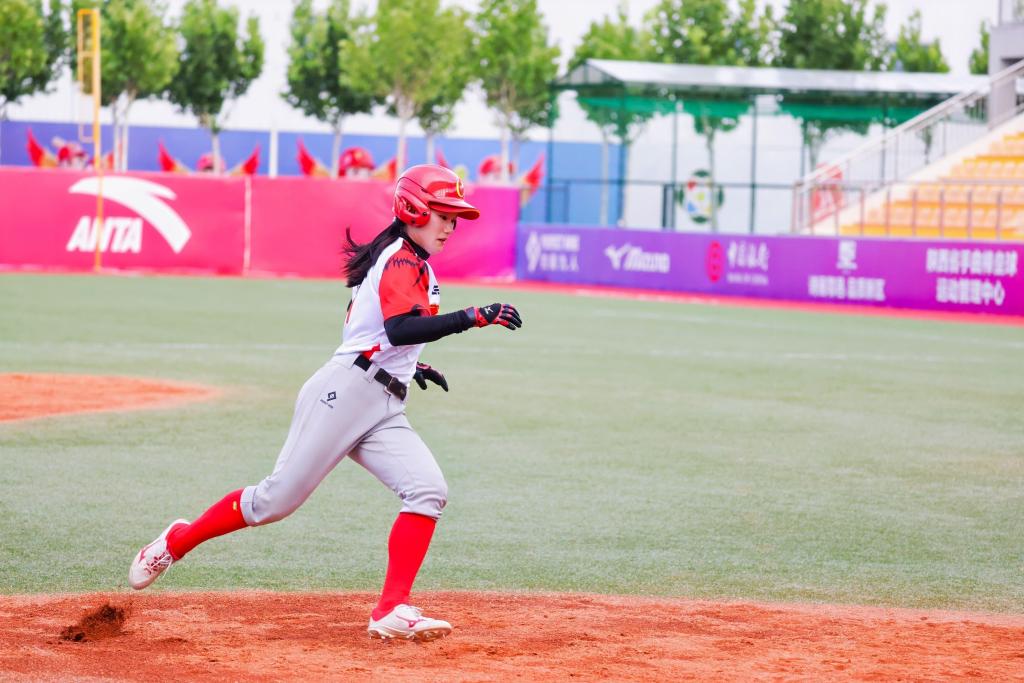 第七局,菲律賓隊率先取得1:0領先。中國隊換上投手魏語辰,沒讓菲律賓隊再擴大領先優(yōu)勢。來自西安體育學院的李欣甜替補上場,她敲出一記安打,搶進一壘,隨后隊友犧牲觸擊將她送入二壘。在隊友兩出局的艱難局面下,顏思語一記安打?qū)⒗钚捞鹚突乇緣景馄奖确值耐瑫r,也讓自己進入一壘。