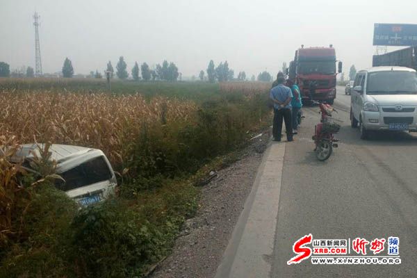 9月16日下午13時(shí)左右,在忻州東外環(huán)108國(guó)道北肖村段,一輛大貨車發(fā)生追尾,將路邊停放的面包車撞到了溝里,所幸車內(nèi)無(wú)人,未造成人員傷亡。(韓偉)