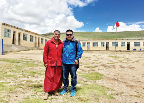 在青海玉樹念經(jīng)湖小學(xué)慈善捐贈(zèng)后與校長合影留念