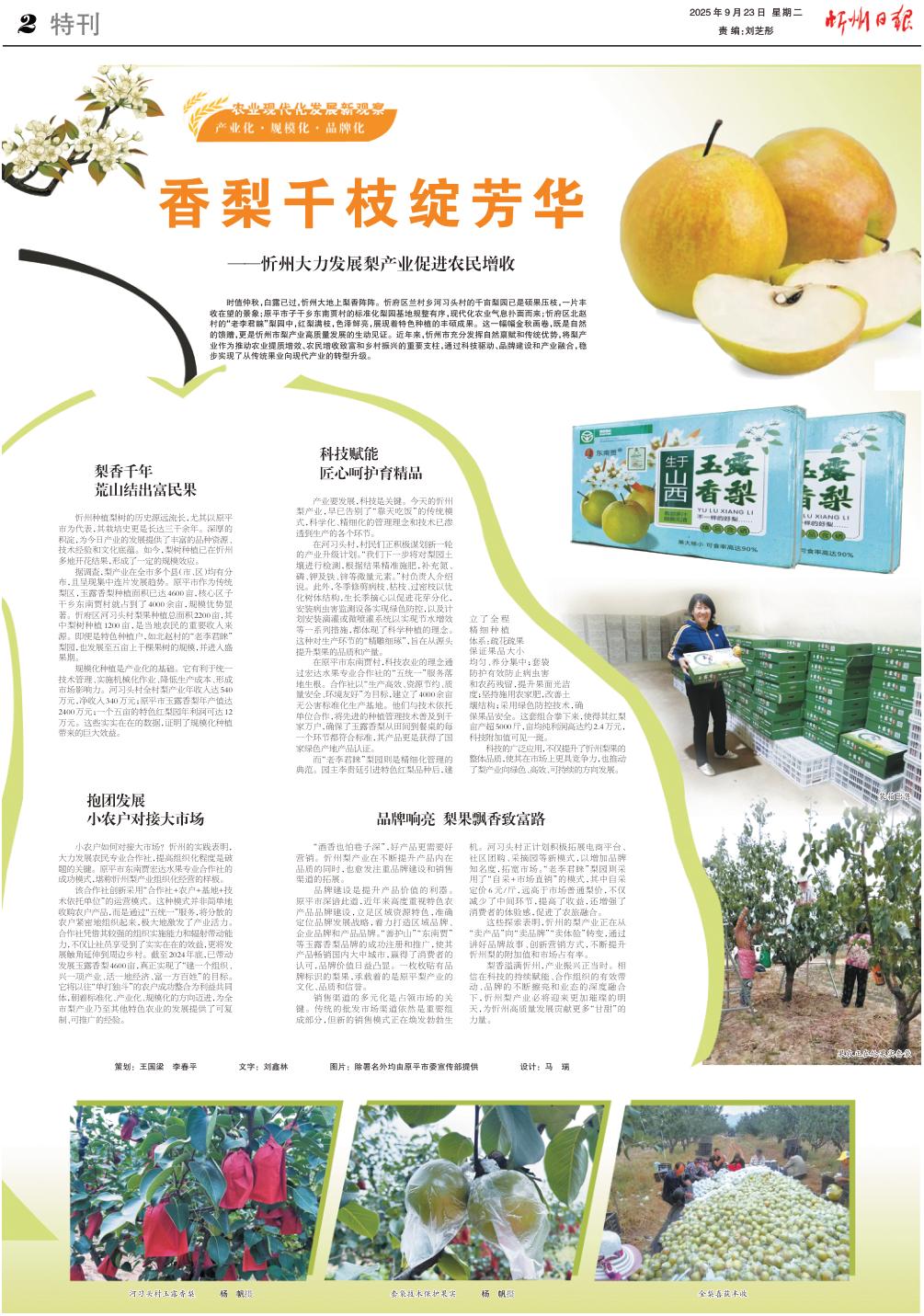 時值仲秋,白露已過,忻州大地上梨香陣陣。忻府區(qū)蘭村鄉(xiāng)河習頭村的千畝梨園已是碩果壓枝,一片豐收在望的景象;原平市子干鄉(xiāng)東南賈村的標準化梨園基地規(guī)整有序,現(xiàn)代化農(nóng)業(yè)氣息撲面而來;忻府區(qū)北趙村的“老李君睞”梨園中,紅梨滿枝,色澤鮮亮,展現(xiàn)著特色種植的豐碩成果。這一幅幅金秋畫卷,既是自然的饋贈,更是忻州市梨產(chǎn)業(yè)高質(zhì)量發(fā)展的生動見證。近年來,忻州市充分發(fā)揮自然稟賦和傳統(tǒng)優(yōu)勢,將梨產(chǎn)業(yè)作為推動農(nóng)業(yè)提質(zhì)增效、農(nóng)民增收致富和鄉(xiāng)村振興的重要支柱,通過科技驅(qū)動、品牌建設和產(chǎn)業(yè)融合,穩(wěn)步實現(xiàn)了從傳統(tǒng)果業(yè)向現(xiàn)代產(chǎn)業(yè)的轉(zhuǎn)型升級。