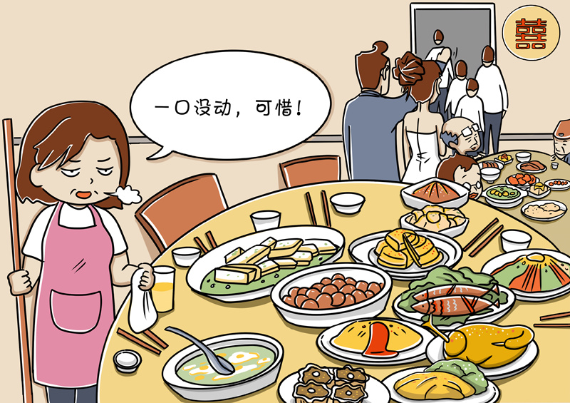杜絕“剩宴”需要社會合力。結(jié)婚“剩宴”并不是短時(shí)間形成的,也不是個(gè)別現(xiàn)象,因此,根治這種陋習(xí)、在全社會培養(yǎng)節(jié)約意識和節(jié)儉習(xí)慣是一項(xiàng)長期任務(wù),也是一項(xiàng)全民行動(dòng),需要社會各界多元化、多角度共同推進(jìn)。比如,黨員干部以身作則,率先垂范;餐飲行業(yè)增強(qiáng)節(jié)約意識,改進(jìn)服務(wù),合理優(yōu)化供應(yīng)標(biāo)準(zhǔn)。只有人人轉(zhuǎn)變觀念,共同做厲行節(jié)約、反對浪費(fèi)的踐行者、宣傳者和監(jiān)督者,才能帶動(dòng)形成良好社會風(fēng)氣。(文字:馬若虎 漫畫:甘甜)