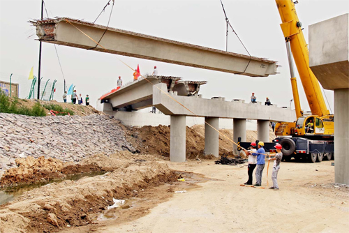 據(jù)了解,牧馬河大橋自開工以來,承擔(dān)大橋施工任務(wù)的太原市政總公司的建設(shè)者們?yōu)楸4髽蚰馨磿r、按質(zhì)、按量建成而日夜奮戰(zhàn),每天投入100多個工人,分“ 三班”倒施工。據(jù)介紹,目前,大橋進入橋面鋪設(shè)階段,工人們每天幾乎進行的是水、陸、空立體施工。從25日一早開始,1臺大型拖車將1公里外預(yù)制的箱梁運來,1臺大型吊車每天張開巨大吊臂在高空輸送箱梁,每個箱梁長為20米、重約60噸,整個橋面共由70塊箱梁組成。據(jù)現(xiàn)場施工技術(shù)人員介紹,過去的牧馬河橋長130米,寬僅有8.5米,嚴重制約著南北向車輛通行。新建的大橋長為140米,7跨30米寬,設(shè)計為雙向四車道。
