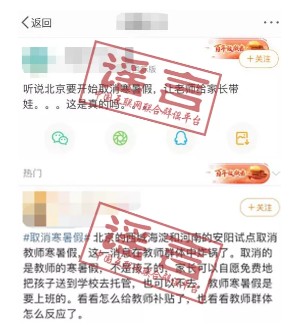 中國互聯(lián)網(wǎng)聯(lián)合辟謠平臺第一時間向教育部相關(guān)部門求證,確認“北京、河南試點取消教師寒暑假”為不實消息。