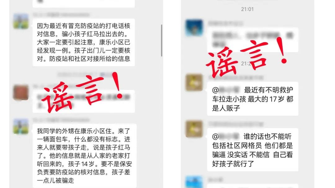 近日,本地微信群傳播:“最近有冒充防疫站的打電話核對信息,騙小孩紅馬拉出去的。大家一定要引起注意,康樂小區(qū)已經(jīng)發(fā)現(xiàn)一例”、“最近有不明救護(hù)車?yán)咝『?,最大?7歲,都是人販子”。