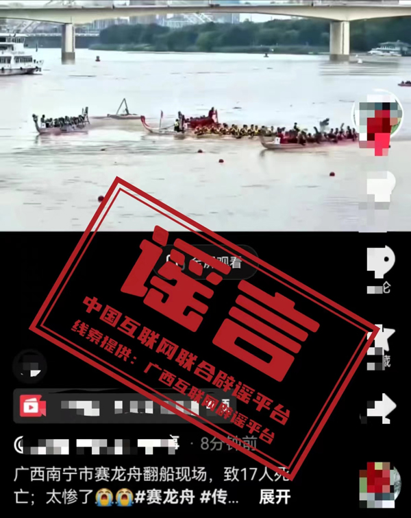 真相:近日,有網(wǎng)友在短視頻平臺發(fā)視頻稱“南寧市賽龍舟翻船致人員傷亡”。經(jīng)廣西壯族自治區(qū)南寧市互聯(lián)網(wǎng)舉報(bào)辟謠平臺向南寧市體育局核實(shí),大賽期間,南寧市紅十字會、南寧市應(yīng)急管理局和消防救援支隊(duì)安排50余名持有救生員資格證的救生人員、10臺救生艇隨時(shí)待命,比賽期間發(fā)生賽艇傾覆的緊急情況后,應(yīng)急救援隊(duì)第一時(shí)間組織救援力量開展施救,成功地將傾覆的賽艇和落水運(yùn)動員一一救起,未致人員傷亡。網(wǎng)傳“南寧市賽龍舟翻船致人員傷亡”系謠言。(來源:廣西互聯(lián)網(wǎng)違法和不良信息舉報(bào)、“南寧舉報(bào)辟謠”微信公眾號)