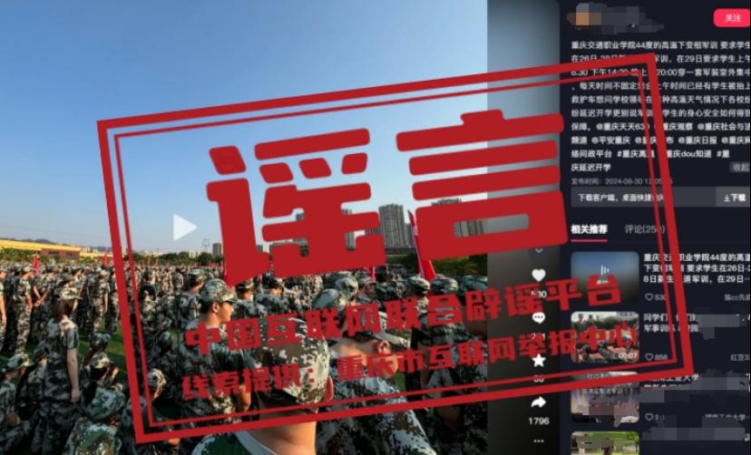 真相:近日,某網(wǎng)民發(fā)布視頻并配文稱“重慶交通職業(yè)學(xué)院要求新生在44度的天氣下進(jìn)行軍訓(xùn),已經(jīng)有學(xué)生暈倒被抬上救護(hù)車”,引發(fā)關(guān)注。經(jīng)向重慶交通職業(yè)學(xué)院核實(shí),近期學(xué)院未安排開展任何軍訓(xùn)活動(dòng),更不存在有學(xué)生因?yàn)楦邷靥鞖廛娪?xùn)暈倒的情況。目前,屬地公安部門已對(duì)造謠者展開進(jìn)一步調(diào)查。(來源:“重慶辟謠”微信公眾號(hào))
