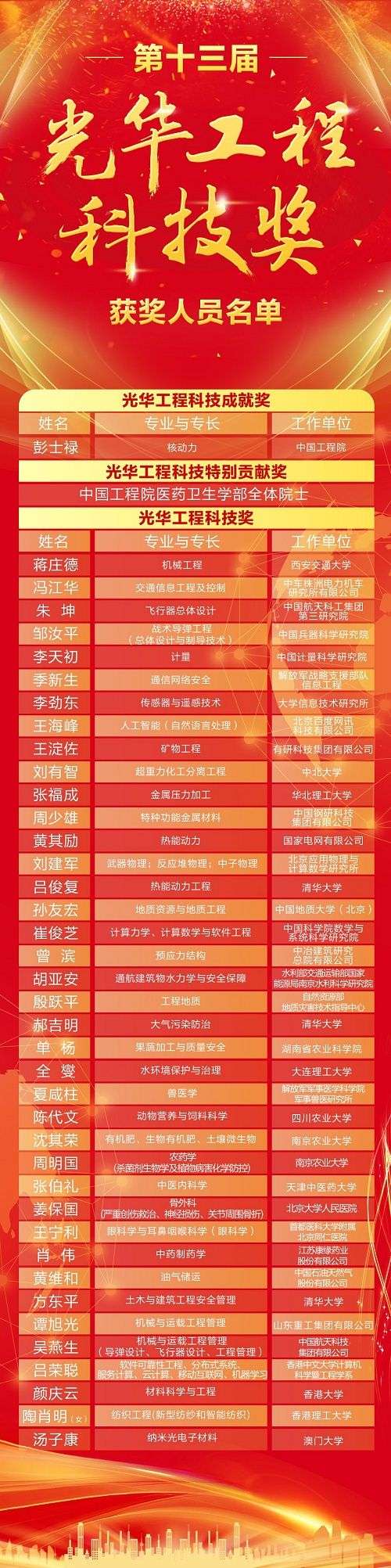 此外,還有機(jī)械工程專家蔣莊德、計(jì)量專家李天初、人工智能專家王海峰、特種功能金屬材料專家周少雄等不同學(xué)科領(lǐng)域的39位專家獲得光華工程科技獎(jiǎng),這些專家均以非凡的積極性和創(chuàng)造性,在各自領(lǐng)域取得了傲人成績(jī),為我國(guó)工程科學(xué)技術(shù)事業(yè)的發(fā)展做出了巨大貢獻(xiàn)。