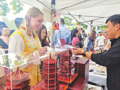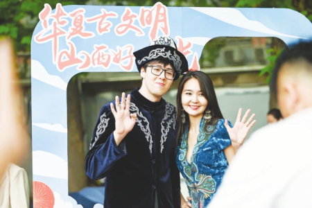 當日活動吸引了來自世界各地的3萬余名師生及社會各界人士。獨唱《人說山西好風(fēng)光》《千年一塔》,舞蹈《醋之韻》《翼城花鼓》等贏得師生們熱烈掌聲。在五大洲文化展區(qū),絳州木版年畫傳承人吳百鎖現(xiàn)場印制木版年畫贈送師生,成為一道亮麗風(fēng)景。廣靈剪紙、應(yīng)縣木塔模型、黎侯虎、寧武毛健茶等吸引各國留學(xué)生駐足欣賞?!叭A夏古文明山西好風(fēng)光”主題相框前,無數(shù)外國友人饒有興趣交流互動,拍照留念?!吧轿髟亍被鸨本┱Z言大學(xué)世界文化節(jié)。