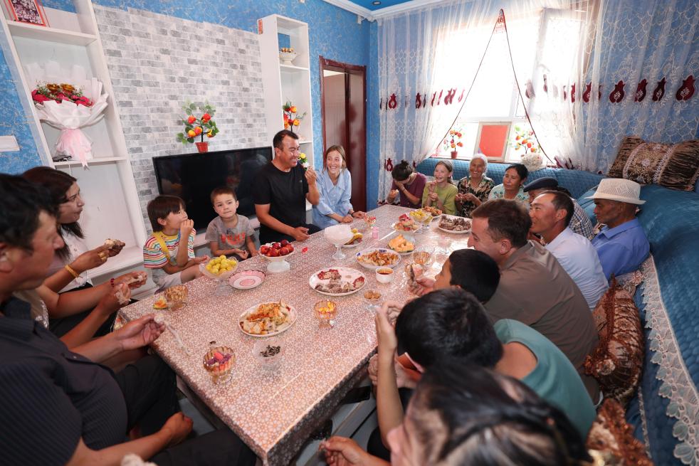 6月30日,烏什縣亞曼蘇柯爾克孜族鄉(xiāng)尤喀克亞曼蘇村居民吐爾洪·艾買提一家搬進(jìn)新房,親朋好友趕來慶賀。新華社發(fā)(楊碩 攝)