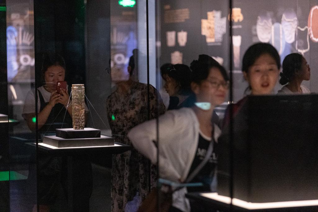 在四川廣漢三星堆博物館文物保護(hù)與修復(fù)館,游客在“匠心妙手——三星堆遺址新出土文物保護(hù)修復(fù)成果展示”試開(kāi)放期參觀(7月22日攝)。新華社記者 唐文豪 攝