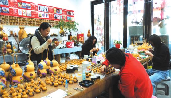 在工作室內(nèi),手工藝人侯晉麗正專(zhuān)注地為葫蘆彩繪。她介紹說(shuō):“我們制作的每一件葫蘆雕刻作品都需要多重工序,從篩選葫蘆到刮皮、晾曬、浸泡、拋光,再到依形構(gòu)思、打稿設(shè)計(jì),最后經(jīng)過(guò)線刻、浮雕等精雕細(xì)琢與上色收尾,每一個(gè)工序都考驗(yàn)著我們的耐心與功力?!?/p>