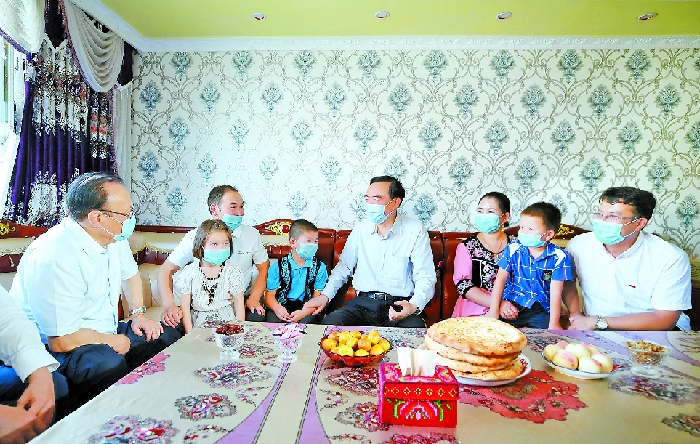日前,自治區(qū)黨委書記陳全國,自治區(qū)黨委副書記、自治區(qū)主席雪克來提·扎克爾在克孜勒蘇柯爾克孜自治州調研統(tǒng)籌推進常態(tài)化疫情防控和經(jīng)濟社會發(fā)展工作。這是陳全國、雪克來提·扎克爾在阿克陶縣絲路佳苑易地扶貧搬遷安置點,走進建檔立卡貧困戶穆拉提·艾海提家中,關心詢問搬遷后的生活情況,勉勵他們持續(xù)增收致富,把日子越過越好。 崔志堅攝