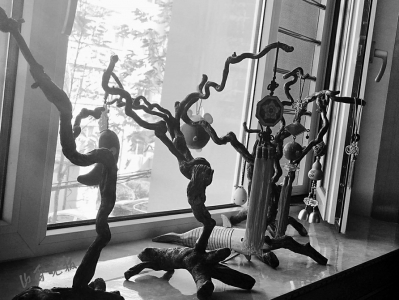見到牛鳴遠(yuǎn)時(shí),他正忙著在家中的陽臺(tái)上懸掛兩個(gè)大樹枝。“這是棗樹枝,還有點(diǎn)濕,得掛起來晾干后才能再進(jìn)行加工?!迸xQ遠(yuǎn)說,朋友收拾平遙老家的房子時(shí),砍了院子里的大棗樹,知道他喜歡根雕,就專門運(yùn)回來一些送給他。