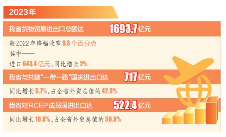 本報訊(記者孟婷)2月14日,記者從太原海關(guān)獲悉,據(jù)統(tǒng)計,2023年我省貨物貿(mào)易進(jìn)出口總額達(dá)1693.7億元,較2022年降幅收窄9.3個百分點(diǎn)。其中,進(jìn)口643.4億元,同比增長2%。同期,我省與共建“一帶一路”國家進(jìn)出口達(dá)717億元,同比增長5.7%,占全省外貿(mào)總值的42.3%。我省對RCEP成員國進(jìn)出口達(dá)522.4億元,同比增長10.8%,占全省外貿(mào)總值的30.8%。