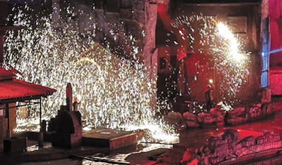 大年初七,晚上7點,山西省晉城市司徒小鎮(zhèn)的山水實景劇《千年鐵魂》準(zhǔn)時開演。當(dāng)臺上的幾位工匠將金黃色的鐵水一齊拋灑向天空,絢爛的鐵花在空中綻放,氣勢磅礴。觀眾的情緒也在此刻到達頂峰。