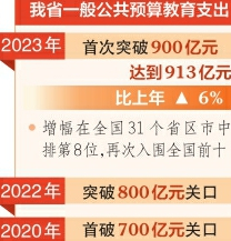 近年來,在財政收入增長有限、財政支出持續(xù)緊平衡的情況下,我省財政性教育經(jīng)費一直保持穩(wěn)步擴(kuò)大的節(jié)奏,各級財政對教育投入只增不減,并保持了較高的支出強度。2020年我省一般公共預(yù)算教育支出首破700億元關(guān)口,2022年突破800億元關(guān)口。2023年我省一般公共預(yù)算教育支出首次突破900億元,達(dá)到913億元,比上年增長6%。